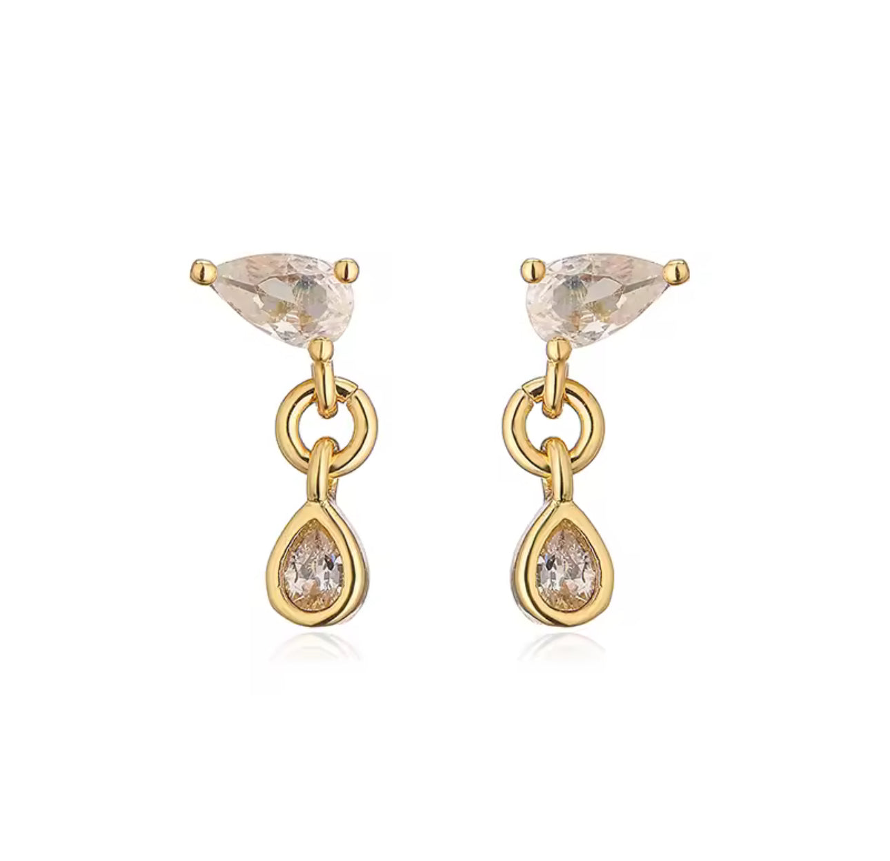 The Aurora Teardrop Dainty Gold Stud Earrings are a delicate blend of light and elegance. Featuring a pear-cut stud at the top with a dainty teardrop crystal drop, they shimmer with every movement, echoing the beauty of the dawn sky.