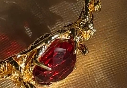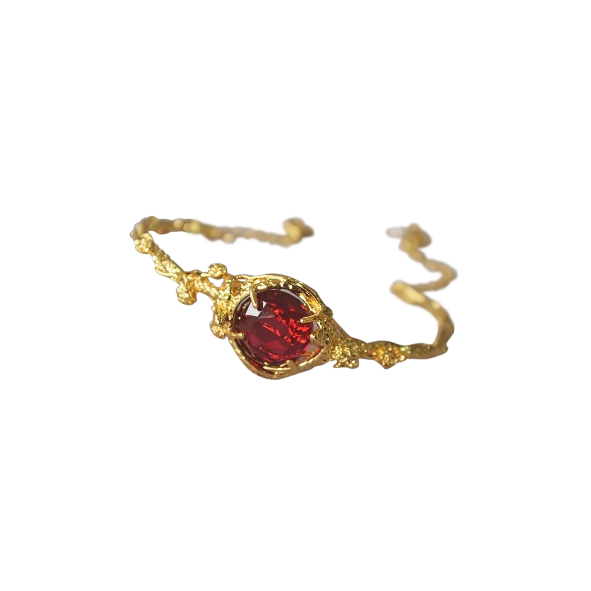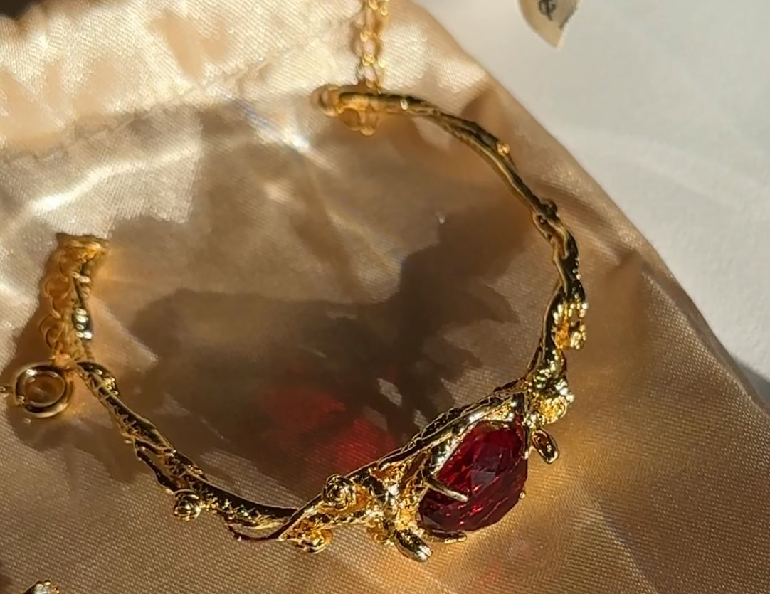 Let the Ruby Red Ocean Crystal Gold Adjustable Bracelet be your guiding star, reminding you to embrace the ever-changing tides of life and to shine brightly amidst the darkest nights. Wear it as a symbol of your inner strength and the infinite possibilities that lie before you. The adjustable feature of this bracelet ensures a perfect fit for any wrist, allowing you to wear it with comfort and style. The bracelet's radiant gold plating symbolises abundance and prosperity, while infusing your aura with a warm and captivating glow.