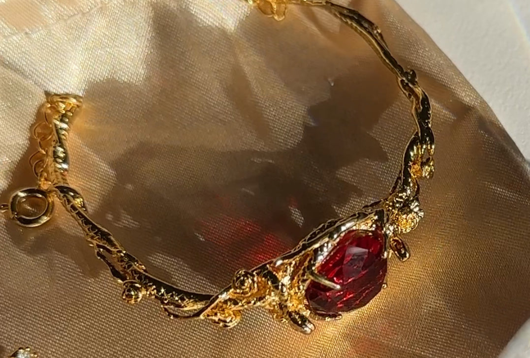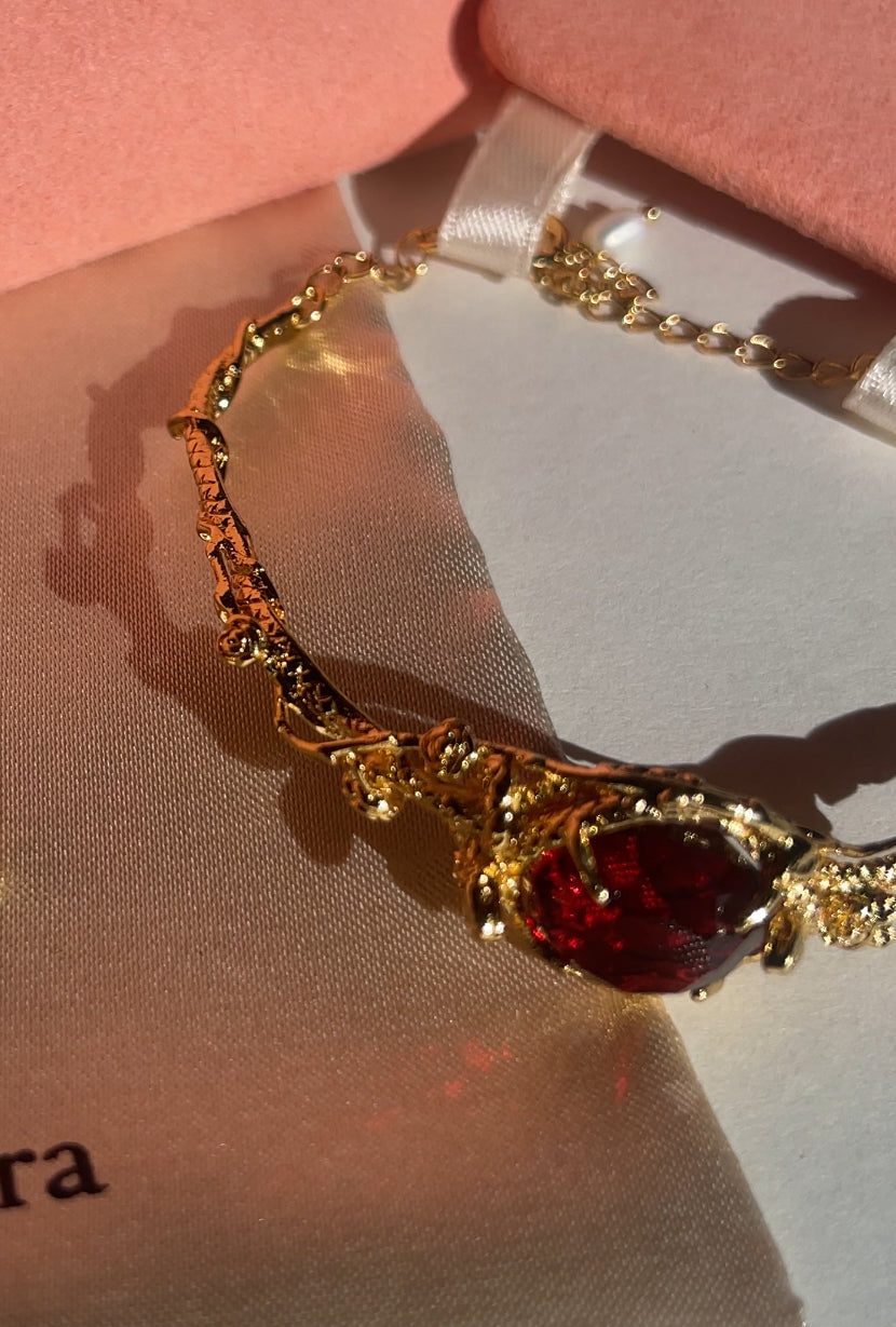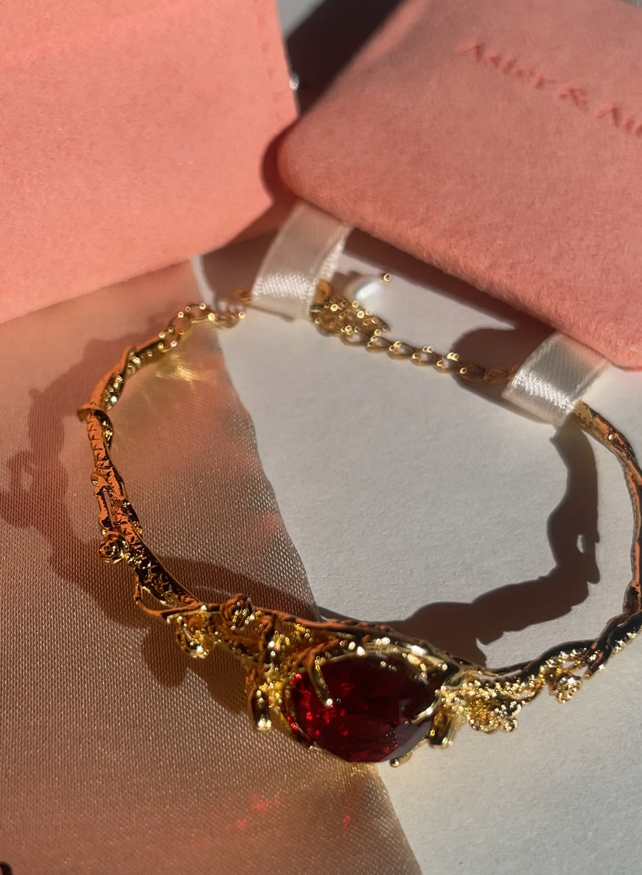 Crafted with utmost care, Aster & Aura's Ruby Red Ocean Crystal Gold Adjustable Bracelet features a stunning ruby red crystal made from cubic zirconia surrounded by a winding array of gold roses. Like a precious gem discovered from the depths of the sea, its fiery brilliance reflects the hues of the setting sun dancing upon the water's surface. The adjustable design ensures a perfect fit, allowing you to wear it comfortably as it delicately adorns your wrist. As you gaze upon the ruby red crystal, you can almost hear the rhythmic crashing of waves and feel the hot summer breeze on your skin.