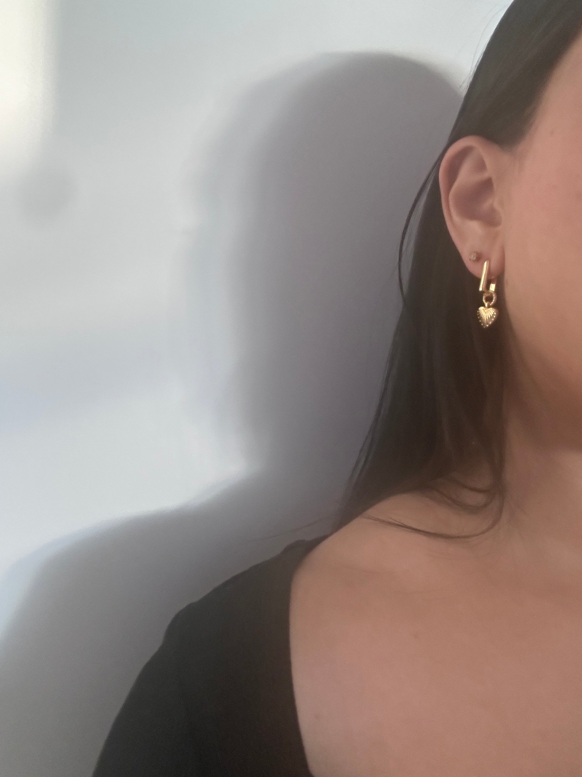 Expertly crafted from brass and plated with 18k gold, these huggies gold heart earrings are designed to be worn with comfort while making a bold statement. The etched detailing on the hearts adds depth and sophistication, capturing the beauty of love and the charm of Parisian nights. Perfect for special occasions or everyday wear, the Luna Heart Rectangle Hoop Huggies bring a touch of romance, elegance, and Parisian magic to your jewellery collection. Let them be as a reminder of love and romantic evenings.