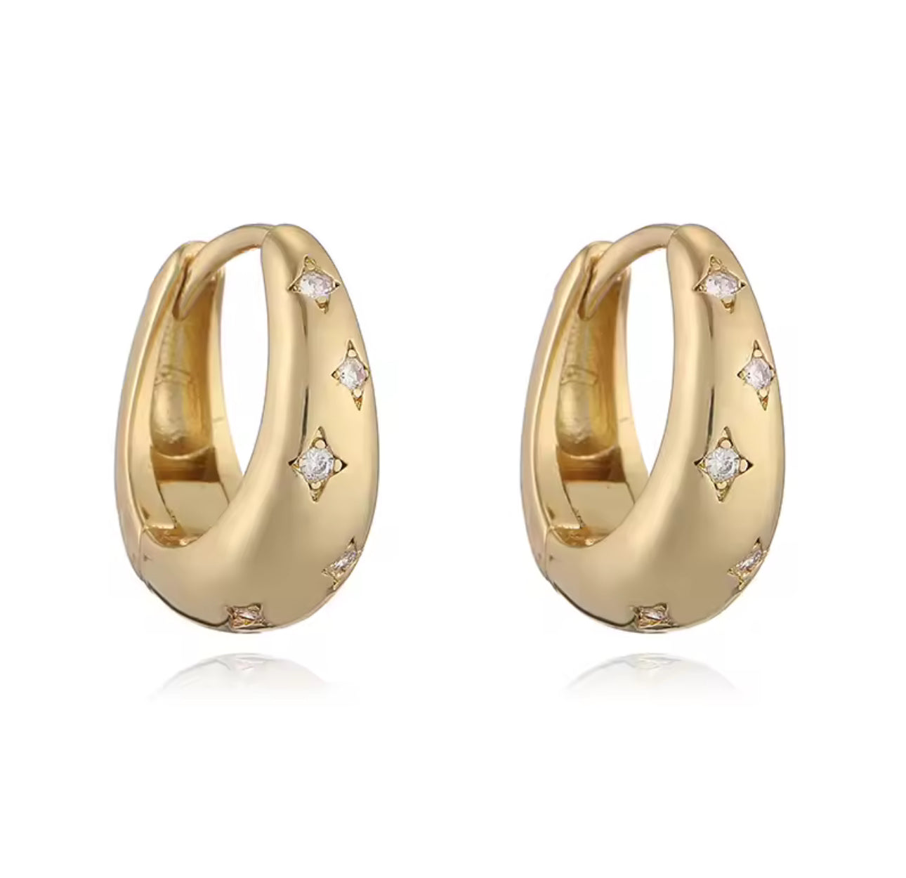 The Solara Dainty Gold Hoop Huggies Earrings capture the warmth of the sun and the elegance of the stars. With a smooth golden finish and delicate star-set stones, these hoops bring a radiant sparkle that feels both timeless and modern. Perfect for everyday wear or special occasions, they hug the ear with a comfortable fit while adding a subtle glow to your look.